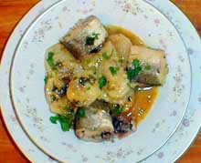 выложил хека, довел до кипения и поставил в духовку до мягкости хека. При подаче