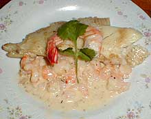 рыбу и подавать полив филе соусом и положив целых креветок сверху. На гарнир