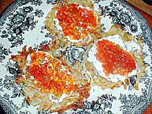 снова прижать и жарить до золотистости. На каждую картофельную галету уложить ложку сметаны, сверху
